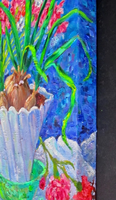 Painted on all sides of the canvas, this still life is pointillistic in style and thick and heavy with paint. The gallery wrapped canvas hangs up against the wall and needs no further framing. Here are some details: